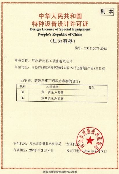 | 持证单位: 河北诺达化工设备有限公司 |